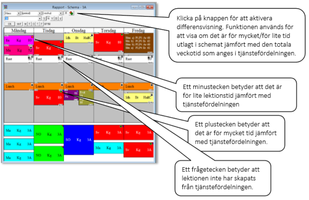Det går att ändra längd på lektioner och sedan kontrollera att lektionslängden stämmer med tiden i tjänstefördelningen. För att ändra längden kan man dra i kanten på lektionen. När plus/minustecknet försvinner stämmer lektionslängden med den i tjänstefördelningen.